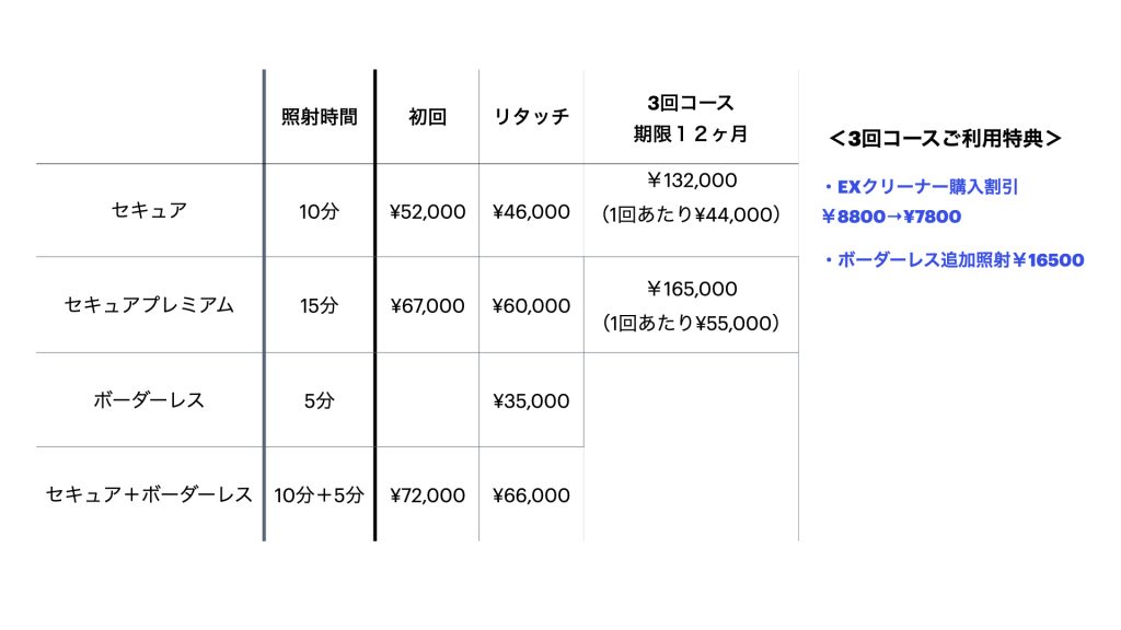 | トランセントセキュアボーダーレス 照射時間 5分 所要時間 45分程度(問診+施術) |